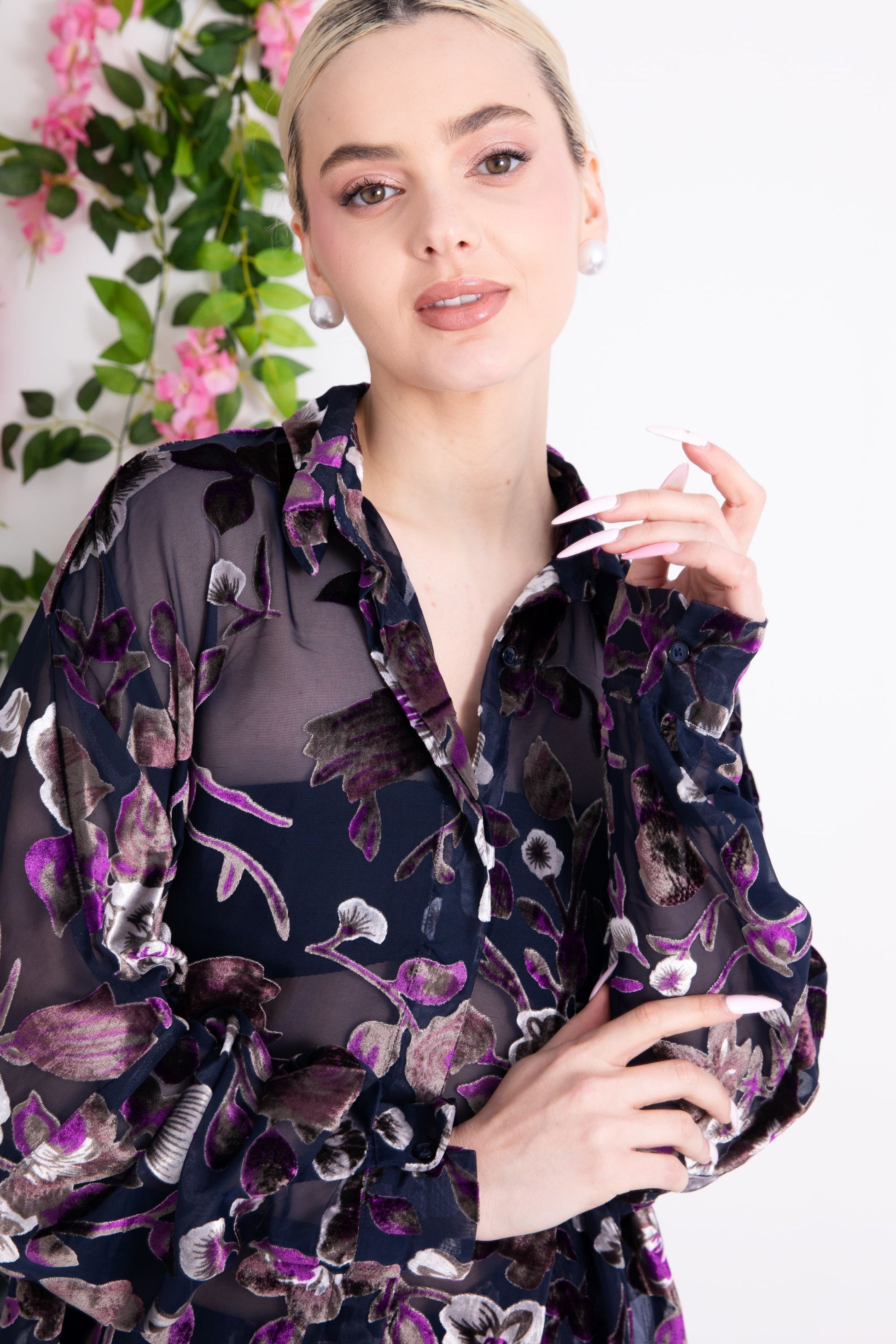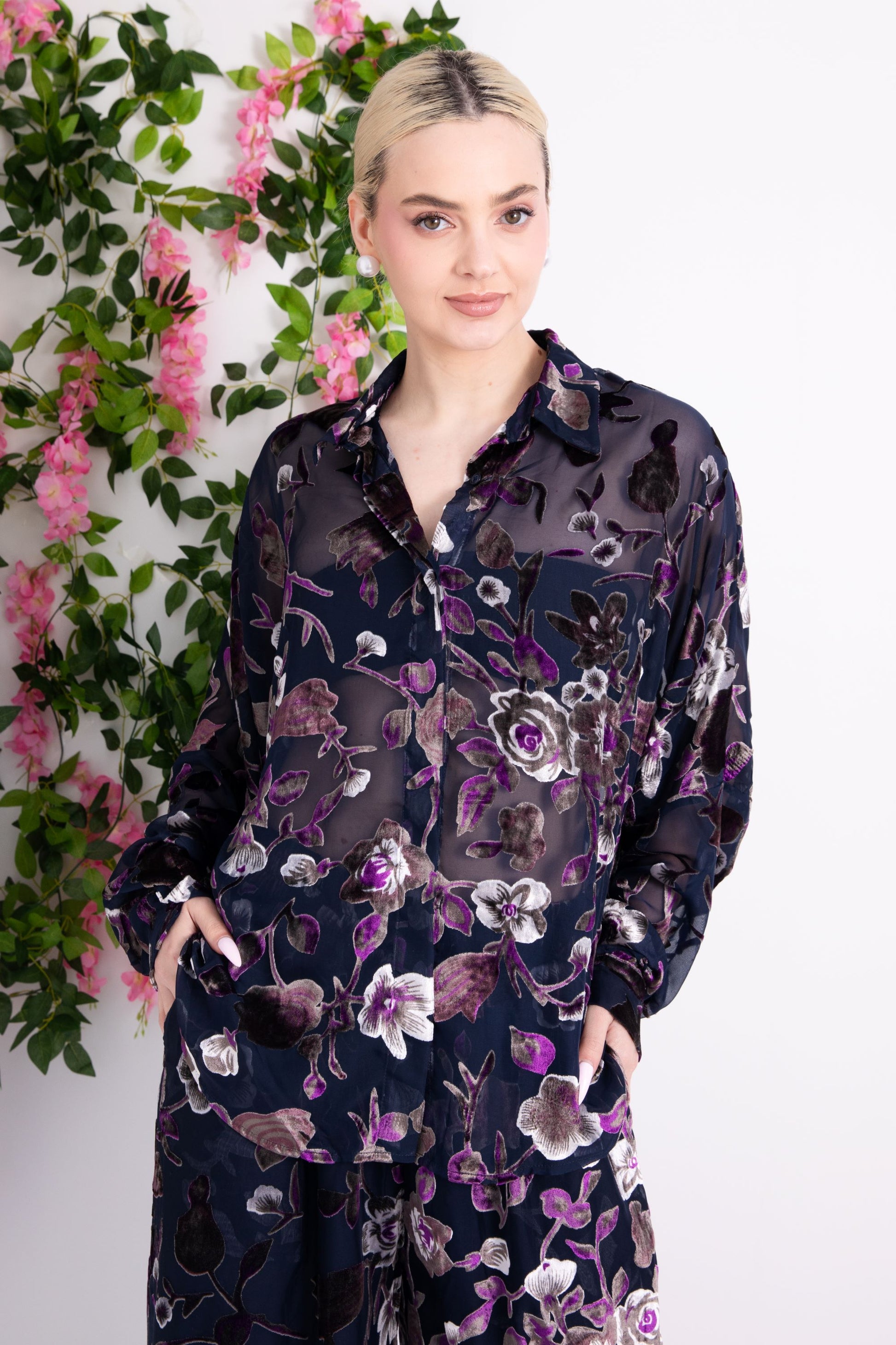 This Lena top features an embossed floral pattern of velvet flowers in varying tones of midnight blue and purple, combined with a subtle sheen,