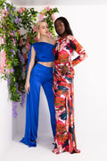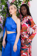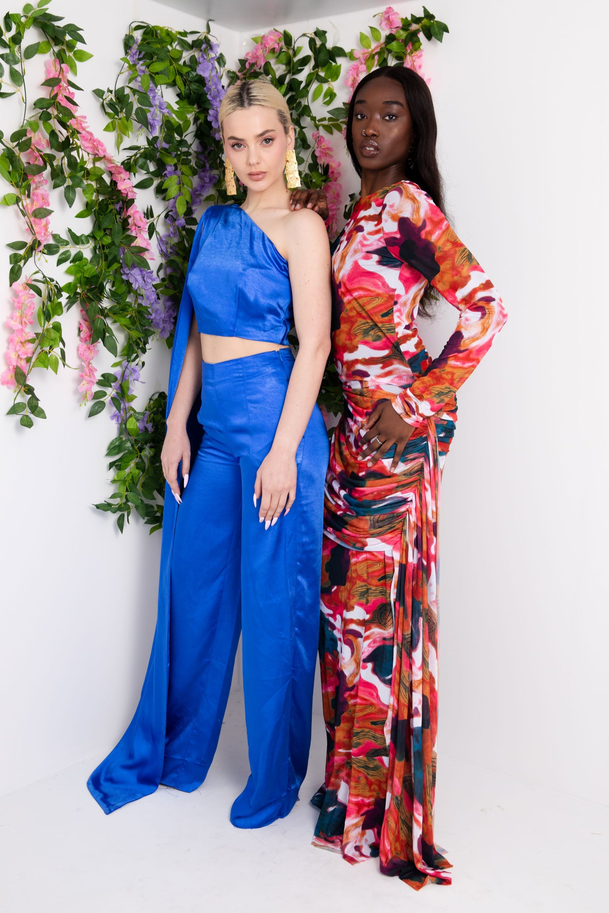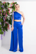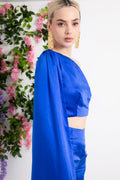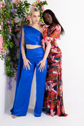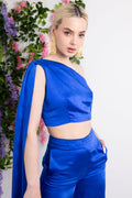 This luxurious silk set is the perfect occasion outfit. Featuring an asymmetric neckline, elegant cape, a rich jewel tone and tailored trousers, this look says you're classy without saying too much.